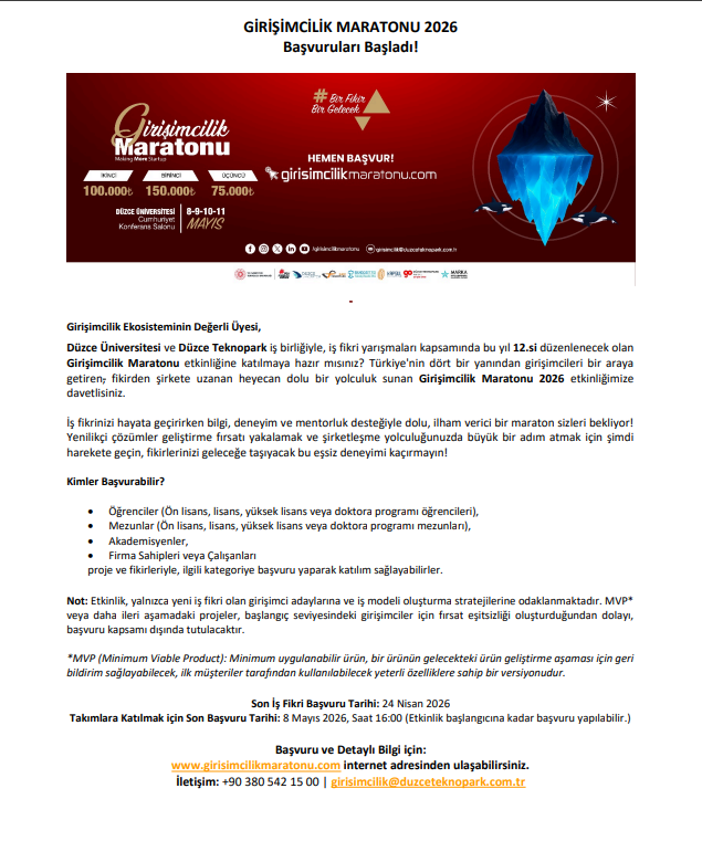Girişimcilik Maratonu, yalnızca fikir sahiplerini değil, aynı zamanda fikirlerin gerçekleşmesine katkı sağlamak isteyen herkesi bir araya getirerek inovasyon ve girişimcilik ekosistemini güçlendirmektedir. Bu etkinlik, katılımcılara değerli deneyimler kazanma, network oluşturma ve girişimcilik alanında kendilerini geliştirme fırsatı sunmaktadır. Bu yıl da iş fikri yarışmaları kapsamında 12.si düzenlenecek olan ve girişimcilere önemli fırsatlar sunan Girişimcilik Maratonu, 8-9-10-11 Mayıs 2026 tarihlerinde Düzce Teknopark'ta gerçekleştirilecektir.